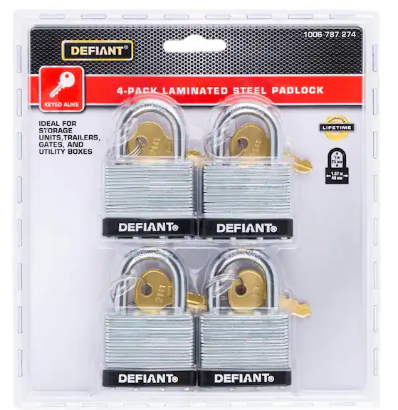 The Defiant Laminated Steel Padlock features a 40 mm body and a 1 in. chrome-plated, hardened steel shackle for increased cut resistance. It is equipped with 4 brass pin cylinders for optimal pick and pry resistance and dual lever locking mechanism for maximum security. The padlock is designed with a form-fitted plastic bumper to reduce scratching and marring. The superior corrosion resistance makes this padlock perfect for indoor and outdoor use to secure storage units, chains, trailers, gates, and utility boxes.