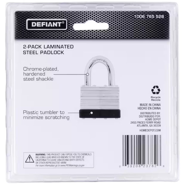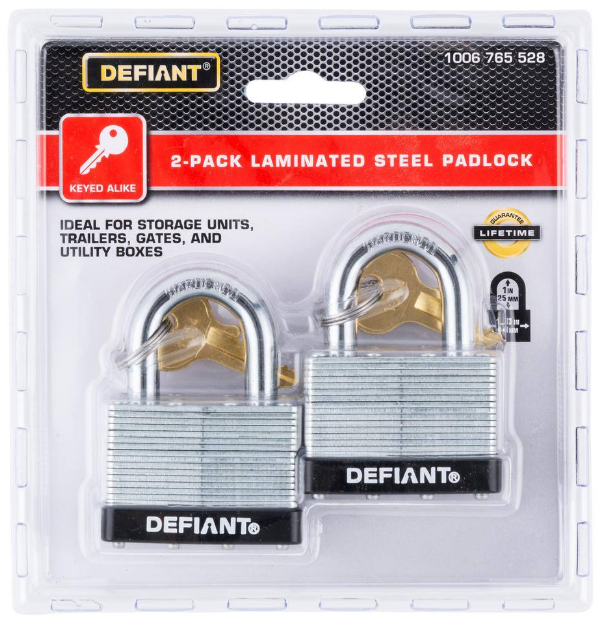 The Defiant Laminated Steel Padlock features a 44 mm body and a 1 in. chrome-plated, hardened steel shackle for increased cut resistance. It is equipped with 4 brass pin cylinders for optimal pick and pry resistance and dual lever locking mechanism for maximum security. The padlock is designed with a form-fitted plastic bumper to reduce scratching and marring. The superior corrosion resistance makes this padlock perfect for indoor and outdoor use to secure storage units, chains, trailers, gates, and utility boxes.
