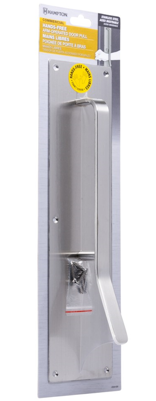 The Hampton 4"x16" Hands-Free Arm Operated Door Pull allows users to open and close a door using only the wrist or forearm. The Hands-Free Arm Operated Door Pull provides a sanitary option to avoid cross-contamination from touching public door handles. The arm pull is manufactured from stainless steel for maximum durability and is suitable for mounting on right/left interior and exterior doors. The door pull is easy to use and fast to install.