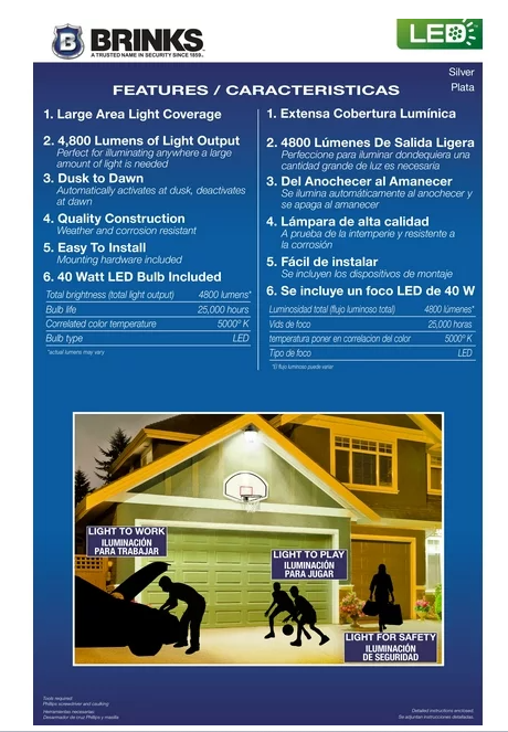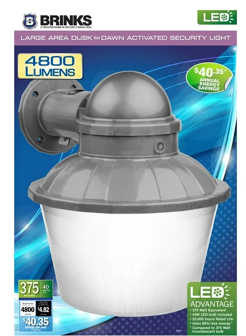 Brink's Integrated LED Large Area Dusk to Dawn Security Light will give your home, backyard, garage or business the overnight lightning it needs. Its made of durable composite and includes a 50 watt LED bulb.There is a protective shade that will keep it safe from animals, debris and weather. This Brink's security light will provide bright light during the evening hours so that you can feel safer. Its illumination is an ideal deterrent for keeping overnight visitors away