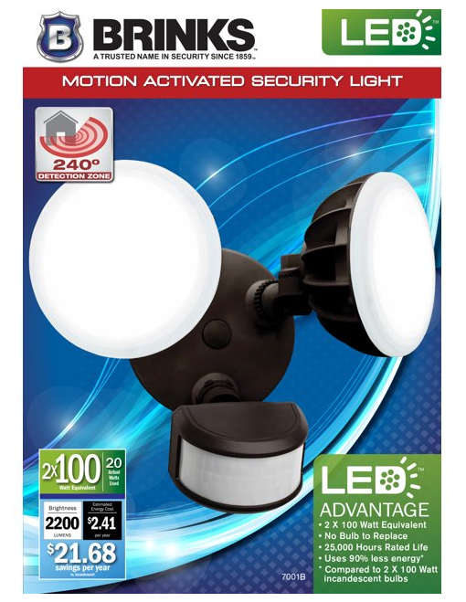 Add superior lighting and security to your home with Brink's Motion Activated Security Light. Equipped with two bright LED bulbs with a lighting output of over 2,000 lumens. With the highly sensitive motion detector, you?ll never have to worry about surprise visitors on your property. Brink's Security Light has up to 70-feet detection range within a 240-degree zone, picking up on any substantial movements. It features a customizable timer control to change ?on time? from 1 minute, 5 minutes to 10 minutes and a high sensitivity detection zone. The security light automatically actives at dusk and deactivates at dawn, with an option of a manual override to be turned ON/OFF with existing wall switch. Adjust the lighting lamp heads and sensors to cover the desired area for the best performance. Ideal for illuminating dark, secluded areas or anywhere extra lighting is needed. As a global leader in security-related products and services, the Brink's name is synonymous with top quality merchandise, ''A Trusted Name in Security since 1859'