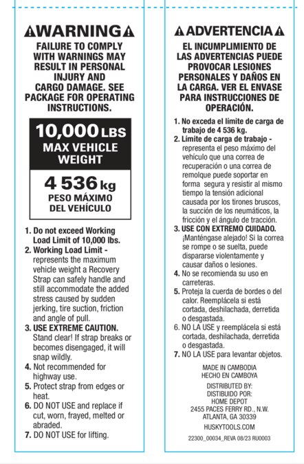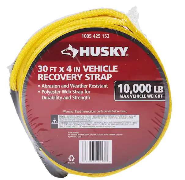 The 30 ft. Vehicle Recovery Strap is constructed with quality material for long-lasting versatility and dependability. It features a durable 4 in. Hi-Test webbing and reinforced black wear guard fabric looped ends. The recovery strap is ideal for emergency towing of stuck or disabled vehicle and is a great alternative for chains. The strap won't rust, rot or mildew and can endure the elements and repeated use. The Vehicle Recovery Strap is lightweight, compact making it portable and easy to store.