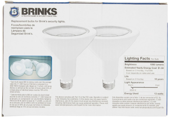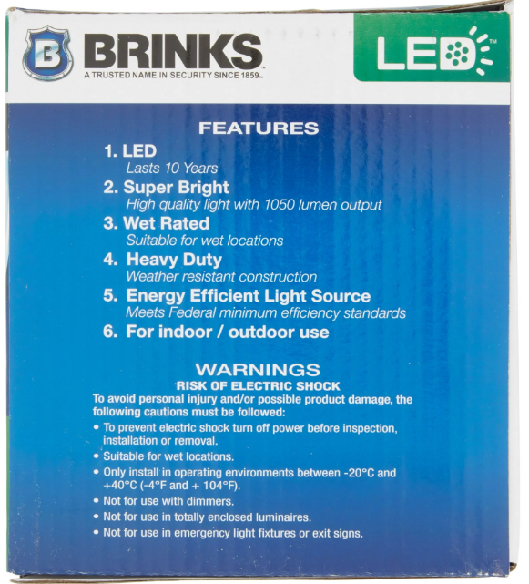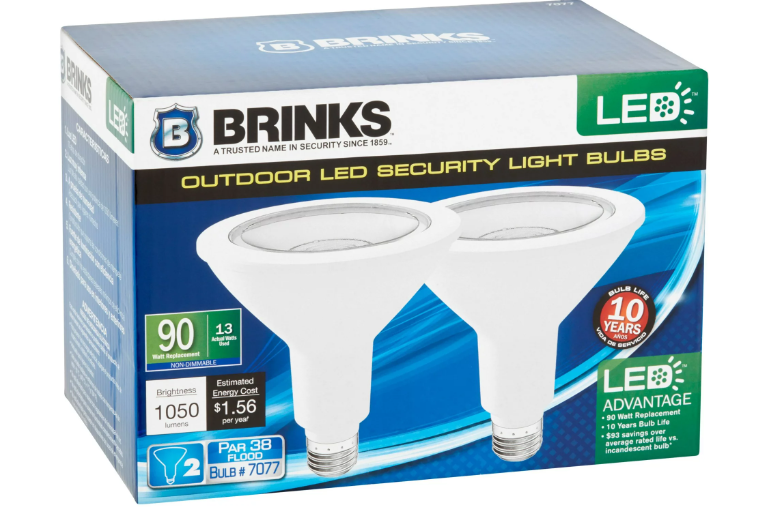 Brink's LED Security Light bulbs delivers bright light for every space. The flood light bulb is dependable as it is versatile, designed to use for both indoor and outdoor applications such as the kitchen, living room, work space, garage, and outdoor security lighting. It offers 10-years rated life (varies upon usage) with a power output of 1050 lumens. The LED bulb last longer and are more energy-efficient than ordinary incandescent bulbs, making them great for security lighting fixtures. Comes in a pack of two.