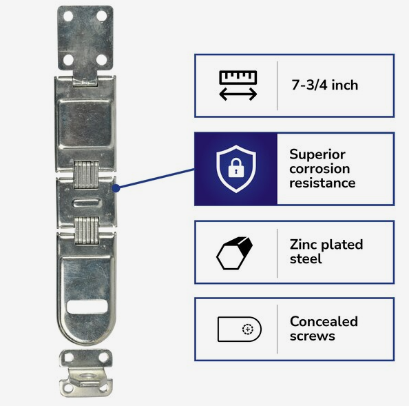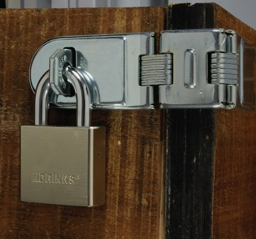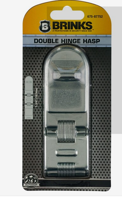 - Features: Brink’s Commercial Steel Double Hinge Hasp Features a hardened steel locking bar and eye for increased cut resistance. The hasp is also coated with zinc to protect against corrosion and outdoor elements.