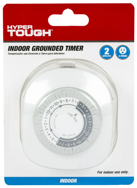 Plug the appliance into the timer and the timer into a power source. Ensure the appliance is turned on. -